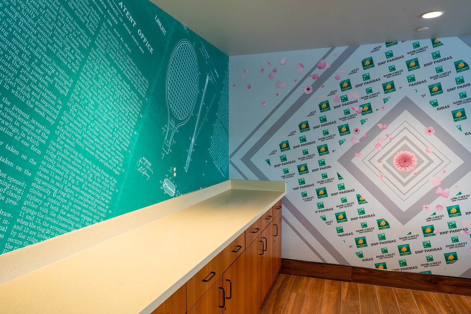 BNP Paribas needed a provider who offered a complete set of services such as site surveys, creative concepts, design expertise, and print production. They also needed installation and creative executions beyond print graphics. Vomela tapped into our national experts to meet the challenge. Several of Vomela’s U.S. facilities collaborated to create wall graphics, posters, SEG graphics and frames, and history displays featuring vintage tennis rackets. The install team solved an issue with low VOC paint, which vinyl graphics do not stick well to, by wiping walls with alcohol and using aggressive adhesive.