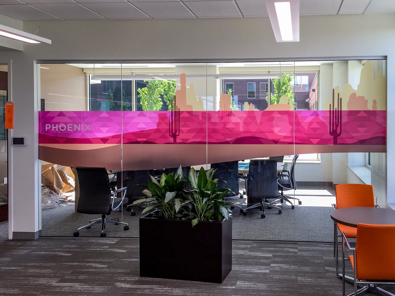 For their headquarters in Lakewood, CO, client First Bank requested conference room glass walls that were functional yet professional to improve the atmosphere of their workspace. Vomela Englewood, designed barrier window graphics for privacy while incorporating creative elements unique to the location such as Pike’s Peak and Mesa Verde. By layering vinyl films – first with solid colored silhouettes on optically clear film and then using a more opaque photo or patterned graphic – we created the contrast and dimension the client wanted.