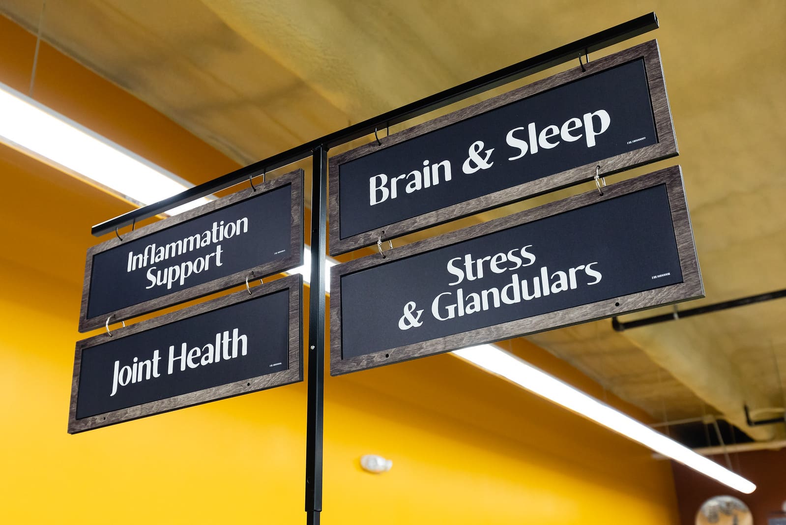 Fruitful Yield, a Chicago-based health foods and supplements chain, needed wayfinding signage and general branding elements to spruce up their new store format. They also wanted a graphics system that could be easily updated by any employee, allowing them to change up their store layout based on customer behaviors. With no previous print graphics to provide reference, the challenge for Vomela  was to concept, produce, and install a graphics package from scratch.