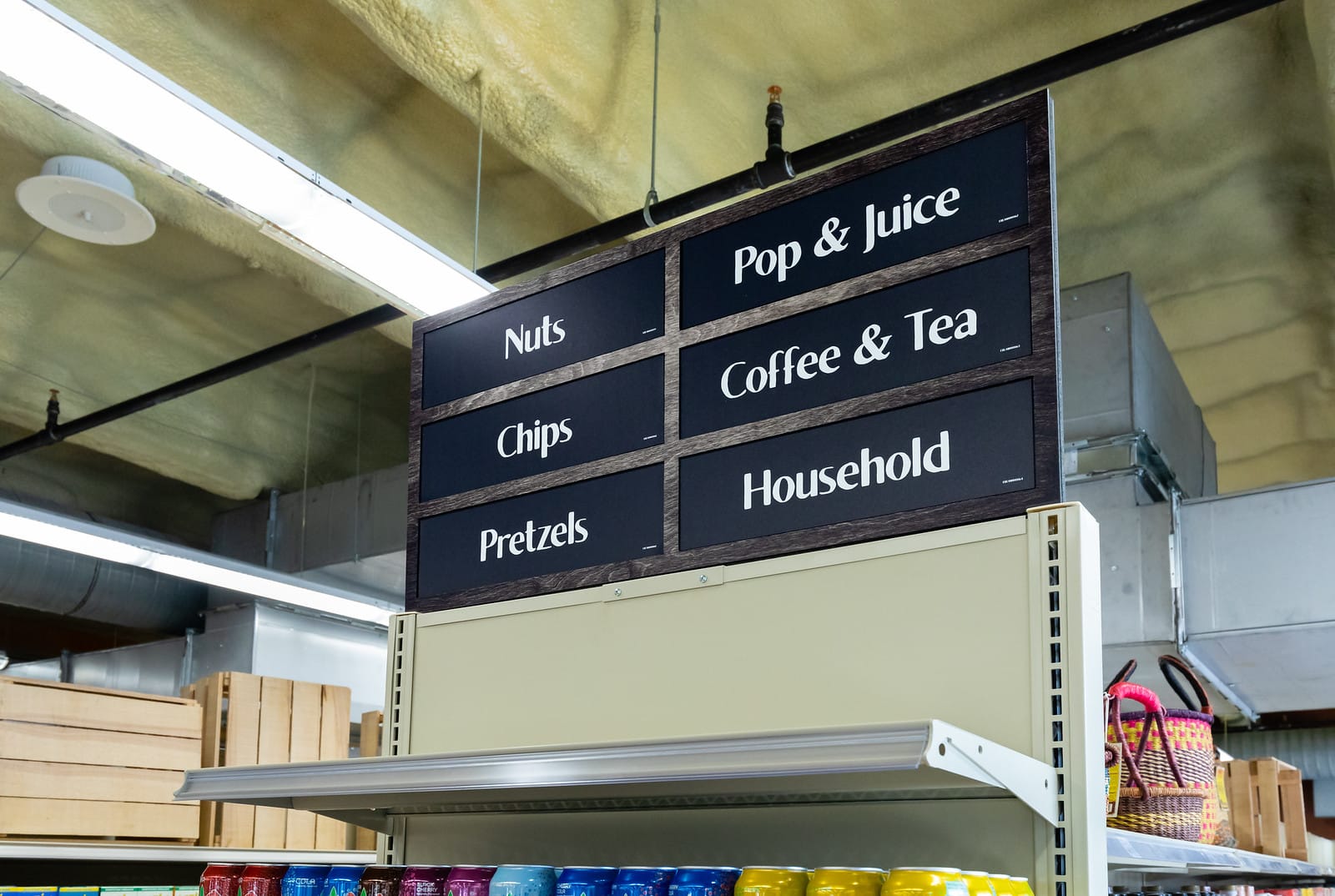 Once the concepts were approved, the work was sent to our Indianapolis facility, where they custom-fabricated a variety of signage systems to fit Fruitful Yield’s new store format. The magnet-based hardware presents a simple way to provide a customizable wayfinding experience.