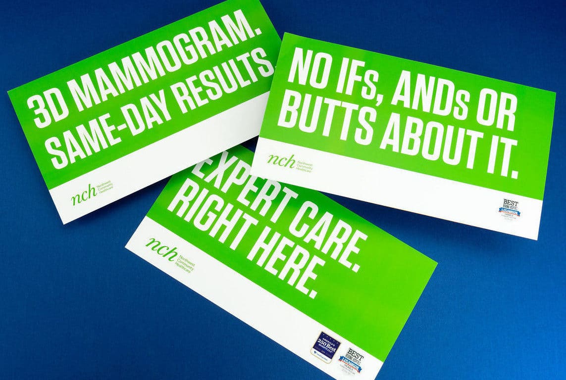 We developed 30 versions of 6”x11” postcards featuring varied imagery and healthcare services. Messaging included reminders for routine checkups such as annual physicals, colonoscopies, or mammogram screenings. The postcards help educate patients on services offered by the hospital, such as orthopedics or cardiology. Through the initial waves of personalized direct mail, the customer has seen a significant uptick in patient appointments, which furthers their personalized wellness mission.